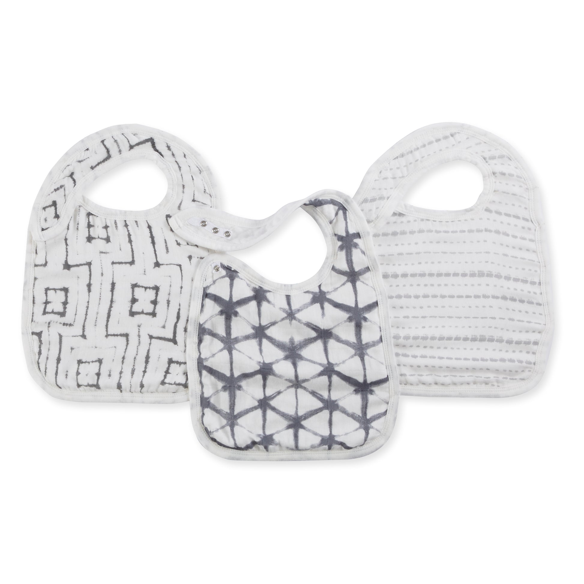 aden + anais pebble classic 3-pk snap bibs. Absorbent: three layers soak up spills, drools, and baby burps. Practical: features multiple snaps in front for easy fastening and an adjustable fit that grows with baby. Durable: stays soft wash after wash. Easy care: machine washable.