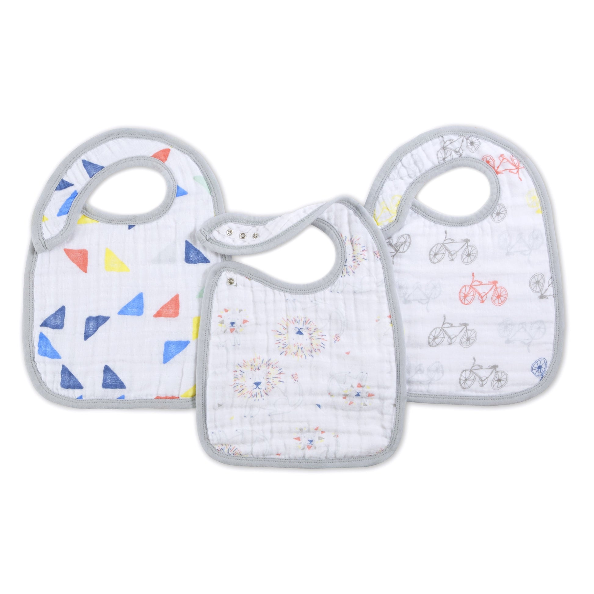 aden + anais leader of the pack 3-pack classic snap bibs. Absorbent: three layers soak up spills, drools, and baby burps. Practical: features multiple snaps in front for easy fastening and an adjustable fit that grows with baby. Durable: stays soft wash after wash. Easy care: machine washable.