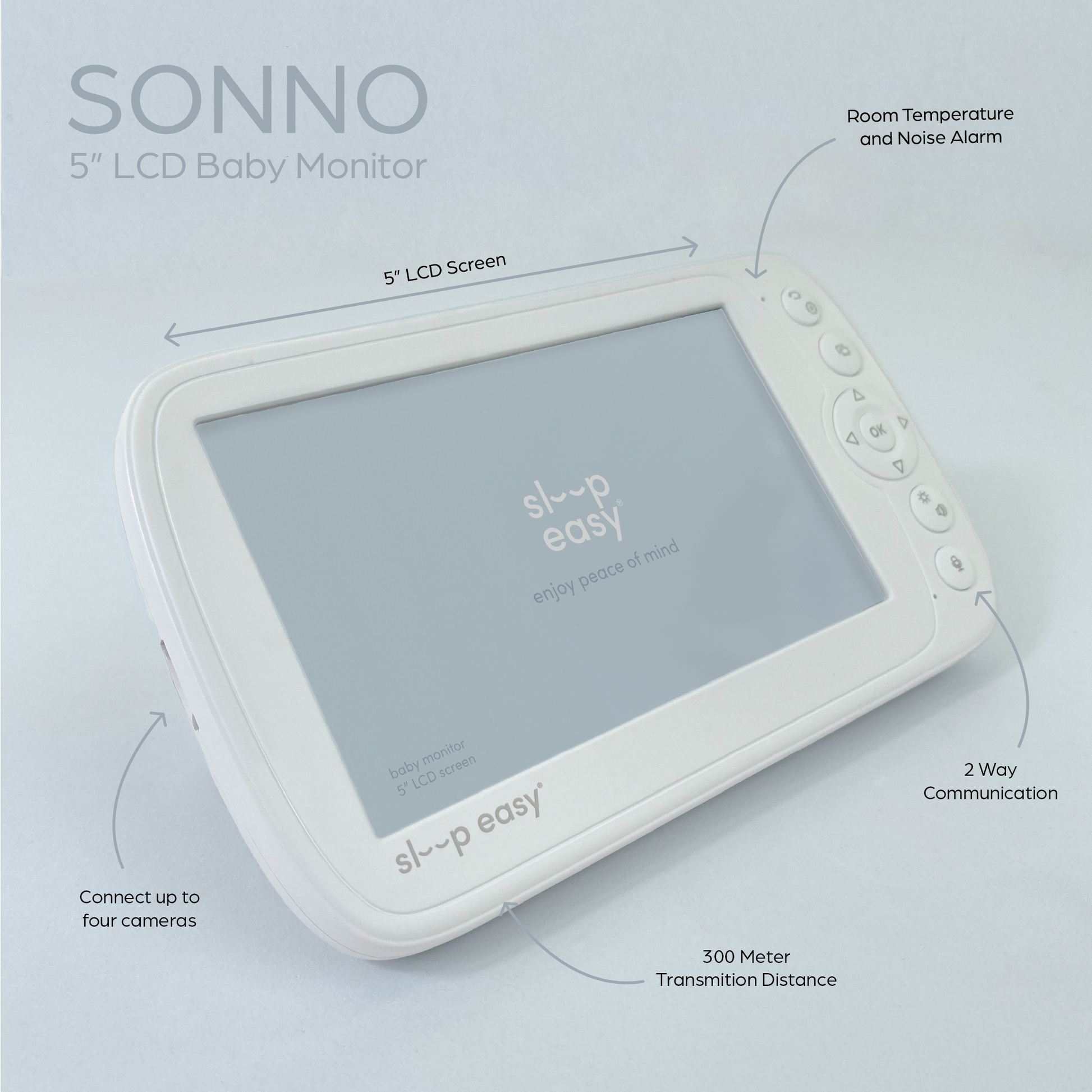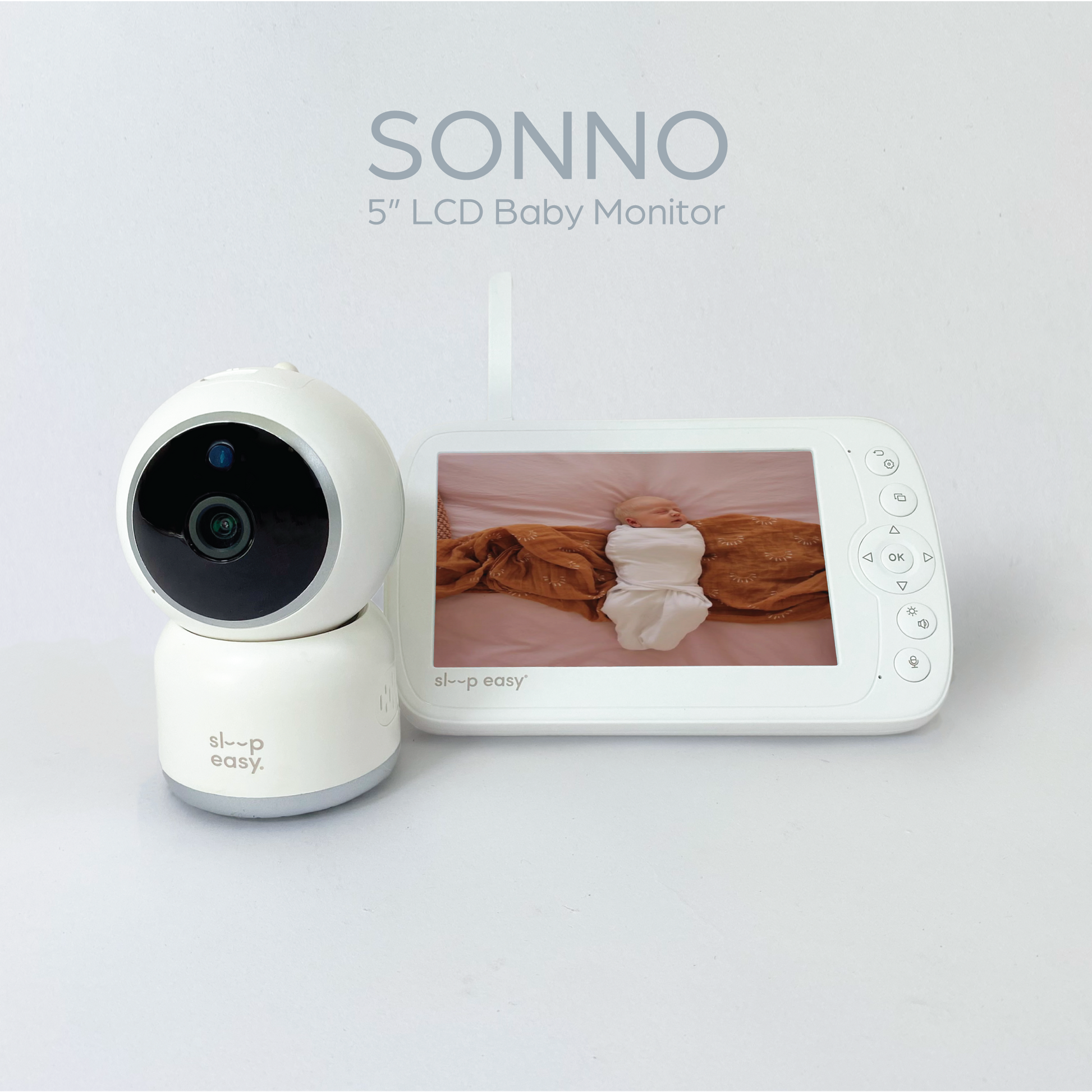 - Meet our all new Sonno Baby Monitor. Watching your little one 24/7 can be a challenging task. The sleep easy 5" Baby Monitor has been designed for parents by parents to bring you added peace of mind, anytime, anywhere.
